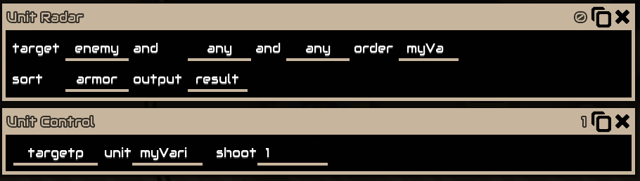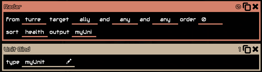 - unit: Refers to a single unit instance. Typically used for the @unit built-in variable, but can also be returned from the Radar or Unit Radar functions, or passed to Unit Bind to control a specific unit instead of cycling through all units of a given type.