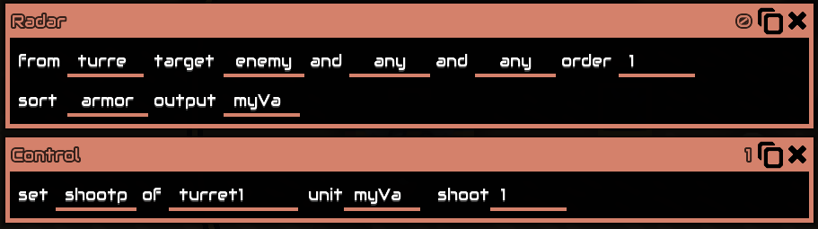 Example (Find an enemy turret. Store coordinates in "turretX" and "turretY", boolead success in "turretFound", and the building's data in "turretRef")