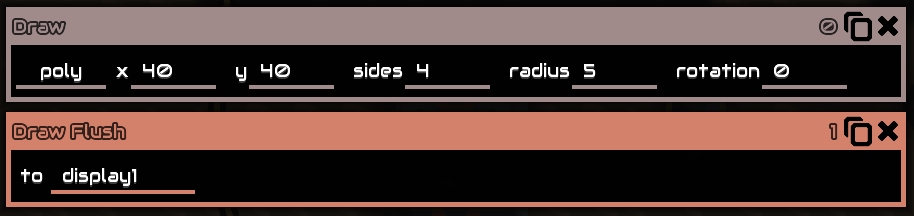 When designing a new system in Sandbox mode, it can be tempting to reach for the largest and fastest processor you can find. However, since Mindustry processors run in parallel, there are many tasks that can be done faster, with fewer resource costs and less coding complexity, by splitting tasks among many small processors (with memory cells to share state between them if needed), instead of one big processor that does everything. For example, you could do all your business logic in a Micro Processor and use a Logic or Hyper processor to draw the results to a graphical display (sort of like a how a real-world PC has both a CPU and a GPU). This comes with the added benefit that the "CPU" can still operate if the "GPU" and graphical interface are destroyed and can't be rebuilt right away (see below).