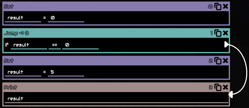 Example (Same example, but with labels. The game converts labels to line numbers, so be sure to save your file and only make edits outside of the game)