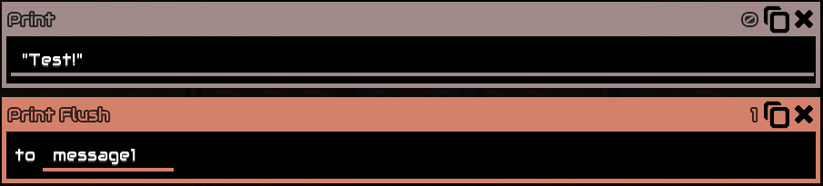 In text form, the command Print adds text to a hidden variable in each processor. The command Print Flush displays the text to a Message block and clears the hidden variable.